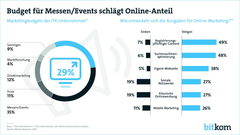 Bitkom Research voert jaarlijks een onderzoek uit naar marketingbudgetten en -maatregelen in de ITC-industrie. Download het complete onderzoek.