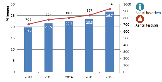 In 2016 nam het aantal festivals per saldo met bijna 100 festivals toe tot in totaal 934 festivals, waaronder 26 nieuwe titels zoals LINDA.festival, Summerpark Festival en Airforce Festival. Het aantal bezoeken is in 2016 toegenomen met 14,6%: in totaal worden er € 26,7 miljoen bezoeken aan festivals afgelegd. De groei zit vooral bij de festivals tot 30.000 bezoeken, grote festivals blijven redelijk stabiel. Cijfers over het festivaljaar 2016 zijn afkomstig uit de nieuwste editie van de Festival Monitor 2017. Met de Festival Monitor volgt Respons - in samenwerking met brancheorganisaties VVEM en VNPF – de ontwikkelingen in het Nederlandse festivallandschap.