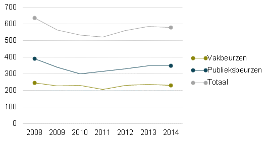 In 2014 stonden er minder vakbeurzen op de kalender, het aantal was daarentegen wel gelijk aan 2012. Het aantal publieksbeurzen daalde in 2014 ten opzichte van 2013 ook, maar blijft wel hoger liggen dan in 2012. Het aantal vakbeurzen blijft in de periode 2008-2014 vrij constant, met uitzondering van het (slechte) jaar 2011. Publieksbeurzen vertonen sinds 2011 een opgaande lijn, na de significante tik die werd uitgedeeld in 2010. Bezoekers waren nog wel voorzichtig met het trekken van de portemonnee, er werd in totaal minder uitgegeven, maar desondanks is er wel een positieve lijn te zien. Dat zijn de belangrijkste conclusies uit het onderzoek van CLC VECTA ism Respons.
