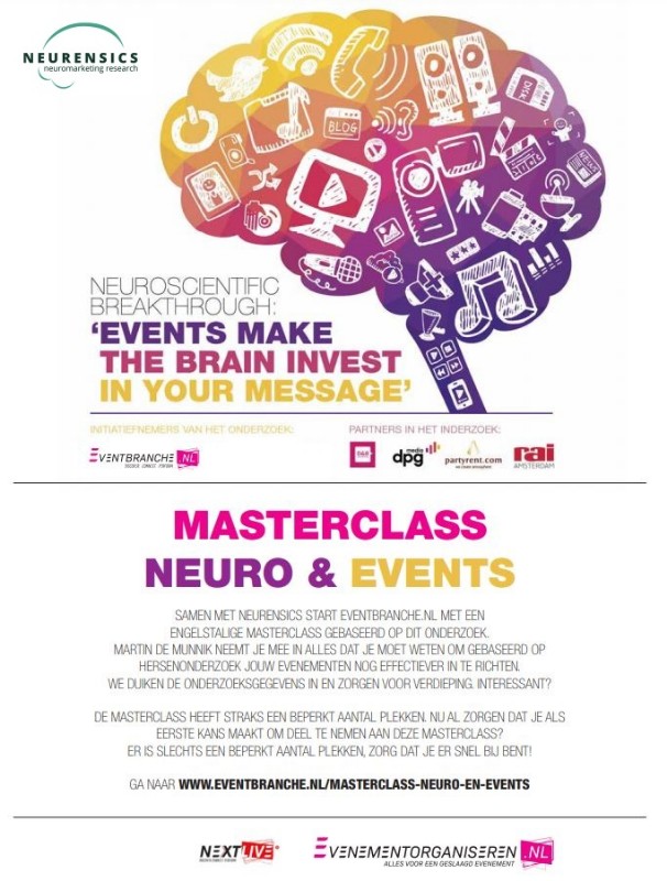 Together with Neurensics, EventBranche.nl and NEXTLIVEdcp.com invite you to the masterclass Neuro & Events. Based on the Dutch neuroscientific research on the power of live communication, Martin de Munnik (neuromarketing research agency Neurensics) takes you a long in all the research-results and everything you need to know to secure your budgets for your live events within the marcom-mix, how to create even more impactful events and how to take 'live' to the next level as the fundamental base of your communication strategy.