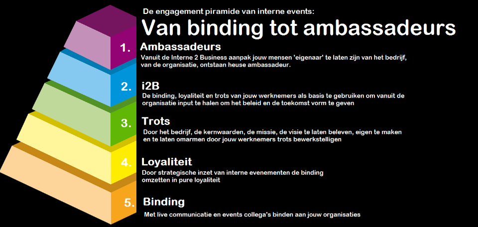 Interne evenementen kunnen stap voor stap tot steeds slimmere, strategische en effectievere impact komen. De Engagement Piramide van Intere Events brengt dat aardig in kaart. In 5 stappen is het mogelijk om met interne events als krachtigste onderdeel van een strategisch intern communicatietraject van binding tot zelfs amabasseurschap te geraken: