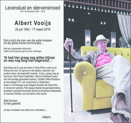 Vooijs was als reisgoeroe ook de ontdekker van veel jong talent en had een oog voor jonge mensen met kwaliteit. Zo zette hij als een der eersten Carel Kraayenhof in en een piepjonge onontdekte Andre Rieu. Zo flamboyant als zijn voorkomen, zo bijzonder zijn afscheidsboodschap. Diverse media pakten zijn overlijdensbericht al op. Vooijs deelt zijn tips voor lekker eten en sluit af met 'Niet treuren, ik heb geleefd!'