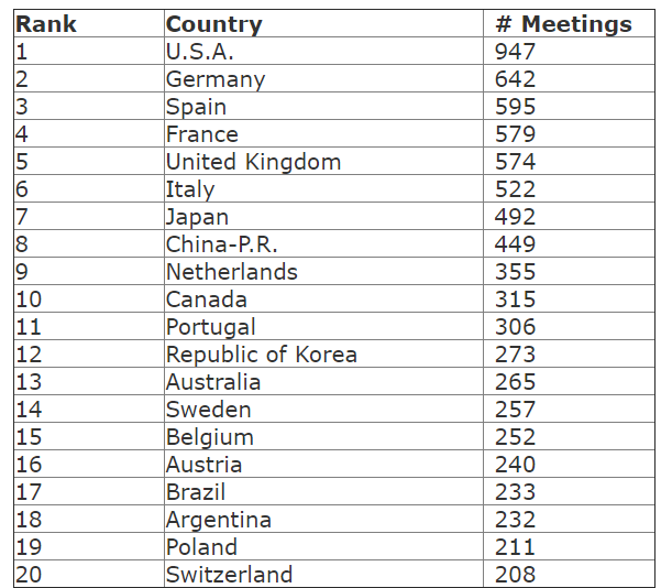 ICCA, International Congress and Convention Association, maakt jaarlijks een ranglijst aan de hand van zogeheten: 'rotating association meetings', die op regelmatige basis georganiseerd worden met meer dan 50 deelnemers.