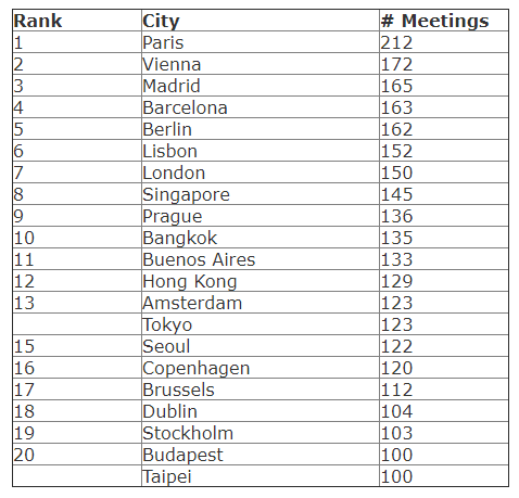 ICCA heeft ook een TOP 20-overzicht gemaakt van de meest populaire bestemmingen en steden: