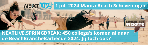Op 1 juli vindt de BeachBrancheBarbecue 2024 plaats, vanaf nu onder de naam NEXTLIVE.SPRINGBREAK. Spring je samen met ons de zomer in bij Manta Beach in Scheveningen? Dan kun je op 1 juli met een team meedoen aan het befaamde beachvolleybaltoernooi. Om vervolgens lekker te eten en daarna jezelf te storten in een prachtfeest.