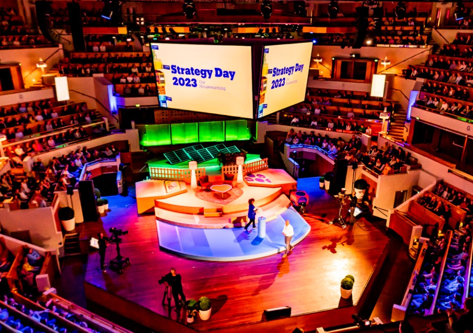 businessmodellen van bol werden vertegenwoordigd door hun respectievelijk directielid in hun ‘eigen kamer’ binnen het strategisch huis dat tot leven werd gebracht op het podium. Ondanks de grote omvang van bol hebben we ervoor gekozen om letterlijk iedereen uit alle lagen van de organisatie tegelijk bijeen te brengen als één geheel, om de nieuwe strategie écht als team te lanceren.