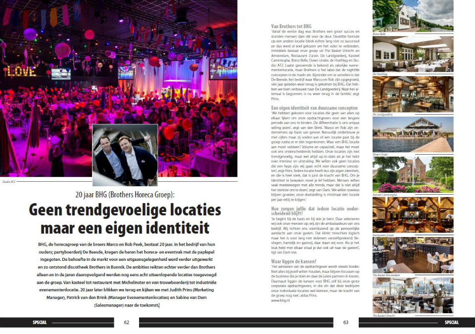 15-03-2017 - EVENEMENTENLOCATIE - BHG, de horecagroep van de broers Marco en Rob Peek, bestaat 20 jaar. Begonnen met discotheek Brothers in Bunnik, bestaat de groep inmiddels uit negen locaties. Van kasteel tot restaurant met Michelinster en van trouwboerderij tot industriële evenementenlocatie. 20 jaar later blikken we terug en kijken we met Judith Prins (Marketing Manager), Patrick van den Brink (Manager Evenementenlocaties) en Sabine van Dam (Salesmanager) naar de toekomst.