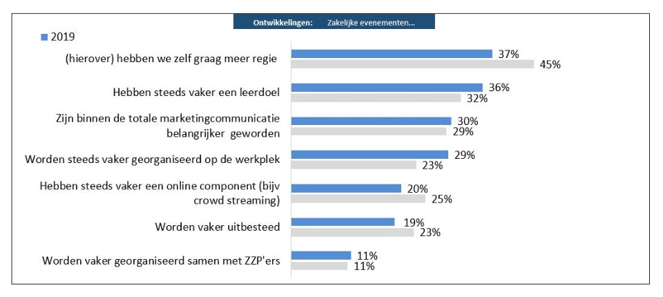 In de tabel is een duidelijke ontwikkeling zichtbaar in het aantal respondenten dat graag zelf meer de regie zou willen over zakelijke evenementen. Waar in 2017 dit percentage nog op 45% lag, is dit in 2019 gedaald naar 37%. Het percentage, op de vraag of evenementen daadwerkelijk vaker worden uitbesteed, is echter licht gedaald. Een mogelijke conclusie zou kunnen zijn dat opdrachtgevers hun evenementen minder vaak extern uitbesteden maar juist wel intern, doordat bedrijven en organisaties vaker eigen event- en projectmanagers in huis hebben.