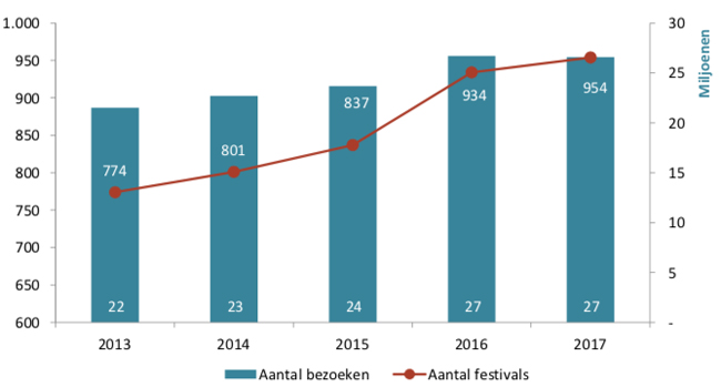 De Vereniging van Evenementen Makers komt al jarenlang op voor de belangen van de evenementenmarkt en publiceert ook nu weer in samenwerking met Respons de cijfers van de festivalmarkt in Nederland. In 2017 is met een totaal van 954 festivals, het aantal festivals opnieuw toegenomen. Voorbeelden van nieuwe titels zijn o.a. Soul Live Festival, Music On Festival en Den Haag Outdoor. Het totaal aantal bezoeken aan de festivals is echter licht afgenomen. Dit jaar ontvingen festivals 26,6 miljoen bezoeken tegenover 26,7 miljoen bezoeken in 2016. Deze daling is te wijten aan een daling aan bezoeken aan vrij toegankelijke festivals.