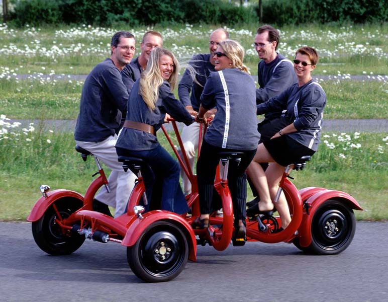 Wil je echt even wat anders, het liefst in de buitenlucht? Pak dan deze 7-persoons vergaderfiets. Deze fiets, een soort driewieler waarbij één iemand stuurt en zes anderen kunnen meefietsen, is een ideaal middel voor een effectieve en zakelijke rit. De eyecatcher leent zich perfect voor teambuilding of een dagje vergaderen in de natuur. Daarbij stimuleert deze sportieve activiteit je brains en is het dus letterlijk meters maken terwijl je belangrijke onderwerpen behandeld.