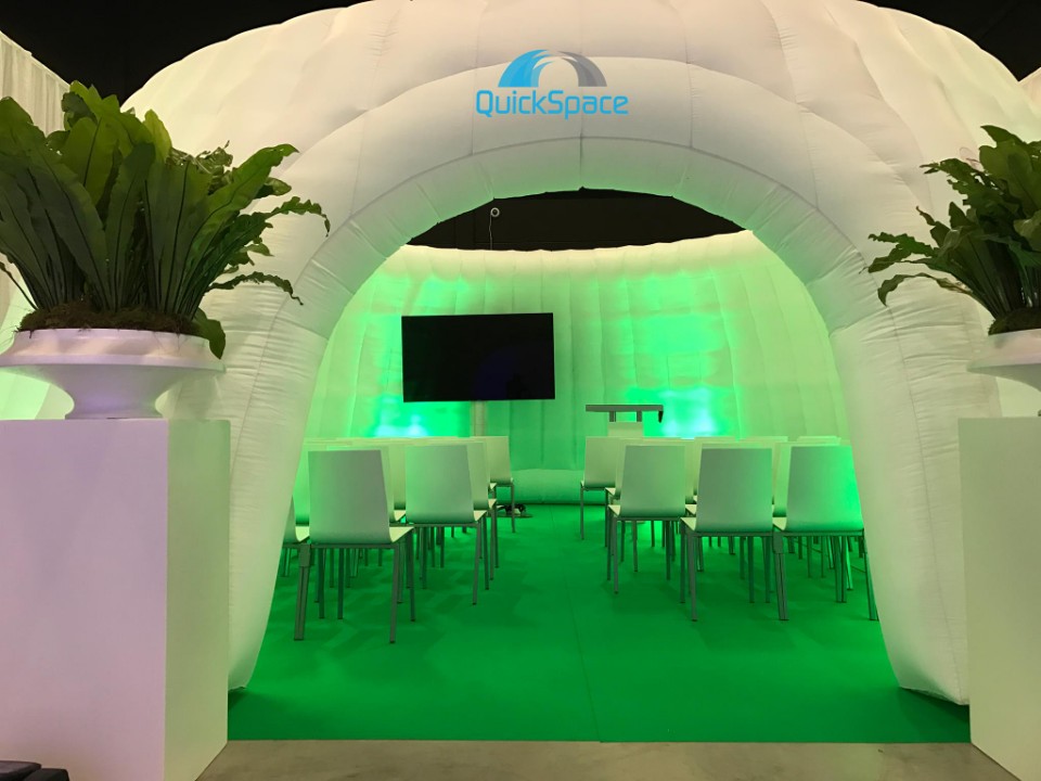 Deze opblaasbare iglo’s zijn een perfecte oplossing op locaties die zelf niet over (voldoende) subruimtes beschikken. Deze inflatable ruimtes zijn makkelijk te installeren en beschikbaar in verschillende vormen en kleuren. Daarnaast hebben ze een goede akoestiek en geluidsdichtheid en een capaciteit tot wel 300 personen.