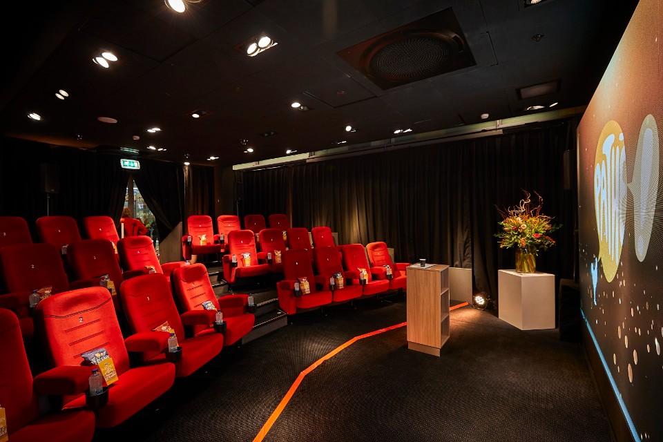 Sit back and relax in de kleinste mobiele Pathé-bioscoop van Nederland. Deze bijzondere break-out ruimte heeft 24 comfortabele bioscoopstoelen, een groot LED scherm van 4.00 bij 2.50 meter en fantastisch geluid. Doordat de stoelen op een tribune geplaatst zijn, heeft elke toeschouwer perfect zicht op het scherm. Daarnaast leent het podium zich ook ideaal voor het presenteren van ideeën, workshops of productpresentaties.