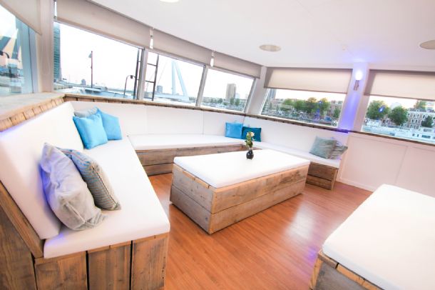 Bon Bon Party Service over de nieuwe varende evenementenlocatie: 'Het schip met 750m2 aan ruimte op het water is divers inzetbaar. Drie ruimtes en een prachtig buitendek zorgen voor een intieme omlijsting van uw evenement. Deze ruimtes kunnen met het oog op verschillende doeleinden worden ingedeeld, hierbij kunt u denken aan een productpresentatie, seminar, diner of swingend feest. Onze thuishaven is Rotterdam, wij varen echter graag naar u toe.'