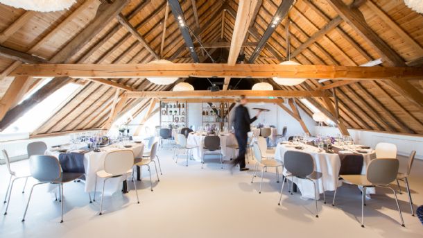 De voormalige hooizolder in het zeventiende-eeuwse Poortgebouw van Buitenplaats Amerongen is door architect Ron Verduijn van Van Hoogevest Architecten getransformeerd. 'Elementen als de ganzenveren designlampen en kunst van de Amerongse kunstenaar Arris Tijsseling springen daarbij in het oog en vormen een spannende combinatie met de imposante balkenconstructie en de authentieke houten kap. De ruimte is voorzien van een comfortabele zithoek, eigentijdse meubelen en accessoires, waarbij veel natuurlijke en zachte materialen zoals hout en stof zijn gebruikt', aldus directeur Peter-Paul Swijnenburg van de historische evenementenlocatie.