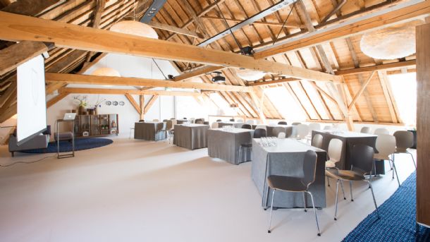 'De ruimte is optisch vergroot door het wegnemen van een aantal spanten en gecombineerd met de nieuwe inrichting is er een compleet nieuwe ruimte ontstaan die licht en intiem is en tegelijkertijd warm aandoet. De ruimte is nu multifunctioneel, waardoor we naast vergaderingen en diners ook een cabaret- of theateropstelling met goede zichtlijnen kunnen bieden. De capaciteit is vergroot naar maximaal 100 personen. Het Poortgebouw bestaat naast de hooizolder nog uit diverse andere ruimten en een riant terras', aldus Peter-Paul Swijnenburg.