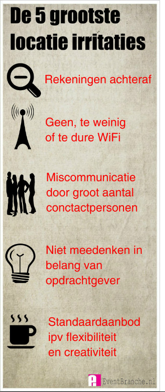 08-08-2014 - EVENEMENTENLOCATIE - De evenementenlocaties en congreslocaties zijn volop in beweging en ontwikkelen zich steeds verder door tot een belangrijke spil in menig evenement of evenemententraject. Toch leverde een rondje langs de velden ook nog heel wat 'oude' irritaties op. Volgens de ondervraagde bureaus en opdrachtgevers* is dit de locatie irritatie top 5: