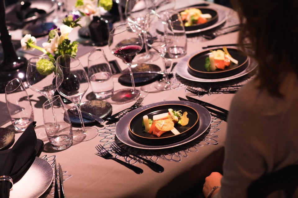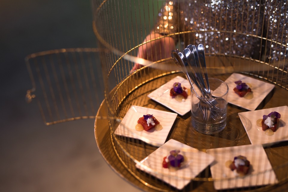 Tafels gedekt met zwart mastiek, uitgesproken glaswerk en bombastische bloemstukken is wat je misschien wel verwacht op een gala-avond. In het goud gehesen Bird Girls die amuses presenteren vanuit hun gouden kooi is wat je als hoteldirecteur niet direct verwacht.
