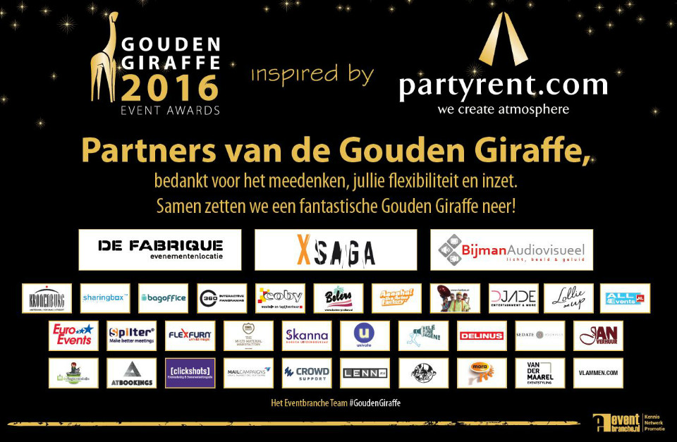 Ook aanwezig zijn tijdens de Gouden Giraffe Event Awards op 10 februari in DeFabrique? Bestel dan nu je tickets! Vier het vak, netwerk, laat je inspireren door de 16 beste evenementen van Nederland en wees getuige van een awardshow die we zonder blikken of blozen 'anders' mogen noemen.