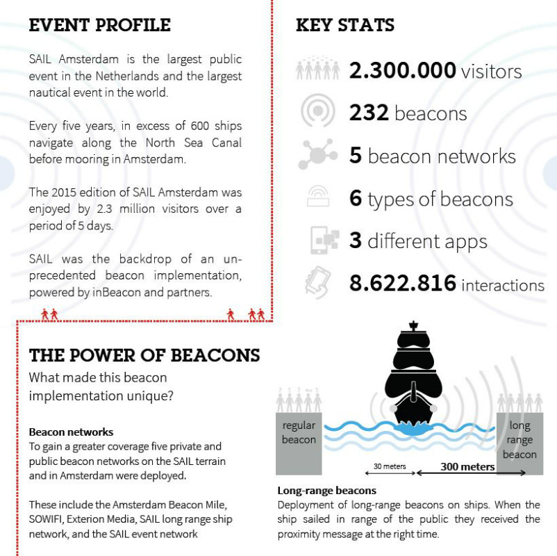 Naast leuke weetjes voor de bezoekers, leverde de inzet van iBeacons tijdens het Sail event waardevolle informatie op voor de organisatie, zoals het meten van de bezoekersstromen. Met 232 Ibeacons, zowel aan vaste wal als op de schepen, creerde het netwerk maar liefst 8.622,816 interacties. Hiermee kon o.a. informatie worden verkregen over het geschatte aantal bezoekers per locatie, populaire routes en de mate van drukte per uur.