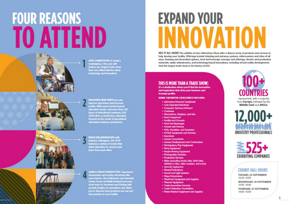 Het creëren van een beleving is tegenwoordig niet voorbehouden aan attractieparken alleen, maar relevant voor allerlei vormen van vrijetijdsbesteding. Daarom is de beurs ook juist interessant voor vrijetijdsaanbieders en eventprofessionals! Zo spreken o.a. Noor Boukema (Coca-Cola), Erik Cosset (Disneyland Parijs), Sander van Stiphout (Amsterdam Arena) en Ellen Verburg (Wildlands) over uiteenlopende onderwerpen gerelateerd aan de vrijetijds-, entertainment- en eventbranche.
