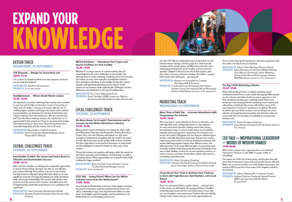 Het uitgebreide conferentieprogramma bestaat dit jaar uit educatieve sessies, workshops en CEO Talks. Sprekers zijn experts op hun vakgebied en komen van vooraanstaande parken en organisaties. Aan de orde komen o.a. de laatste trends en ontwikkelingen op het vlak van technologie, marketing en communicatie, eten en drinken, duurzaamheid, veiligheid, entertainment en parkbestedingen.