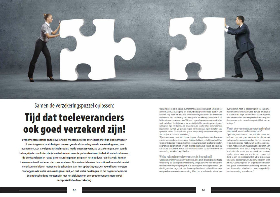 In het onlangs verschenen EventBranche Magazine vertelt Michiel Bredius, van KLAP Evenementenverzekeringen, over het belang van een aansprakelijkheidsverzekering voor toeleveranciers, de toegevoegde waarde hiervan én waar je op moet letten.
