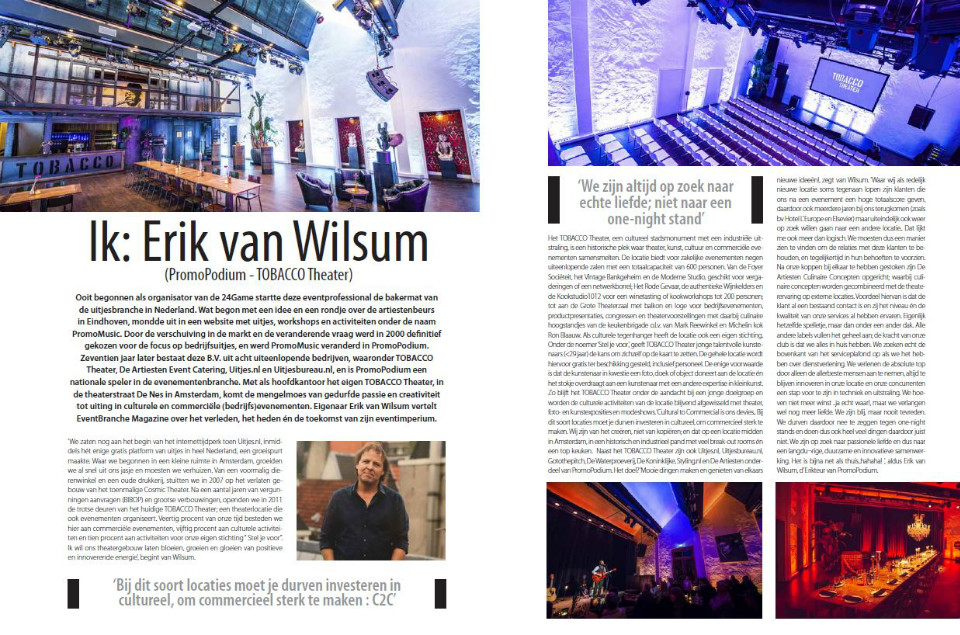 24-03-2017 - EVENEMENTENLOCATIE THEATER - In het TOBACCO Theater komt de mengelmoes van PromoPodium, bestaande uit acht labels, samen in culturele en commerciële (bedrijfs-)evenementen. Eigenaar Erik van Wilsum zoekt met gedurfde passie en creativiteit altijd naar de overtreffende trap van vernieuwen. Zijn bedrijven gloeien tot in detail van positieve en innoverende energie. 'We zijn blij, maar nooit tevreden. We hoeven niet meer winst, maar verlangen wel nog meer naar liefde'.